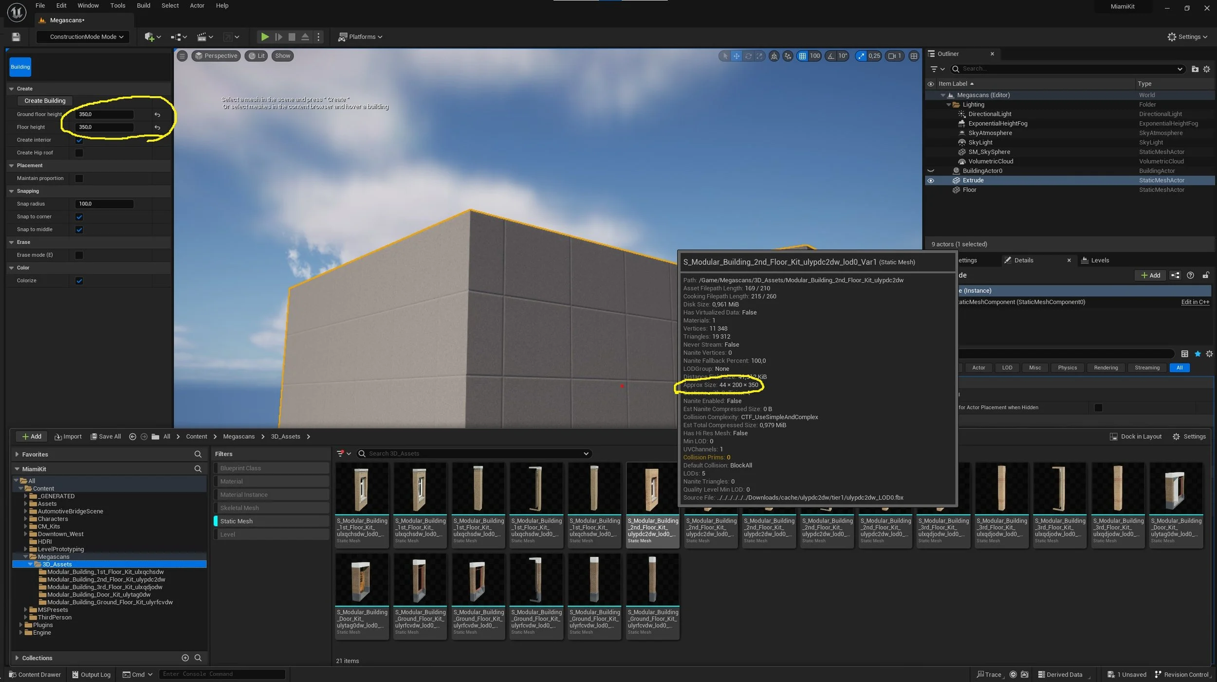After you're done, save all the assets, and you're all set to jump into Construction Mode. To set the floor heights, hover your cursor over one of the assets to see its dimensions. This helps you adjust the ground and mid-floor heights in Construction Mode.