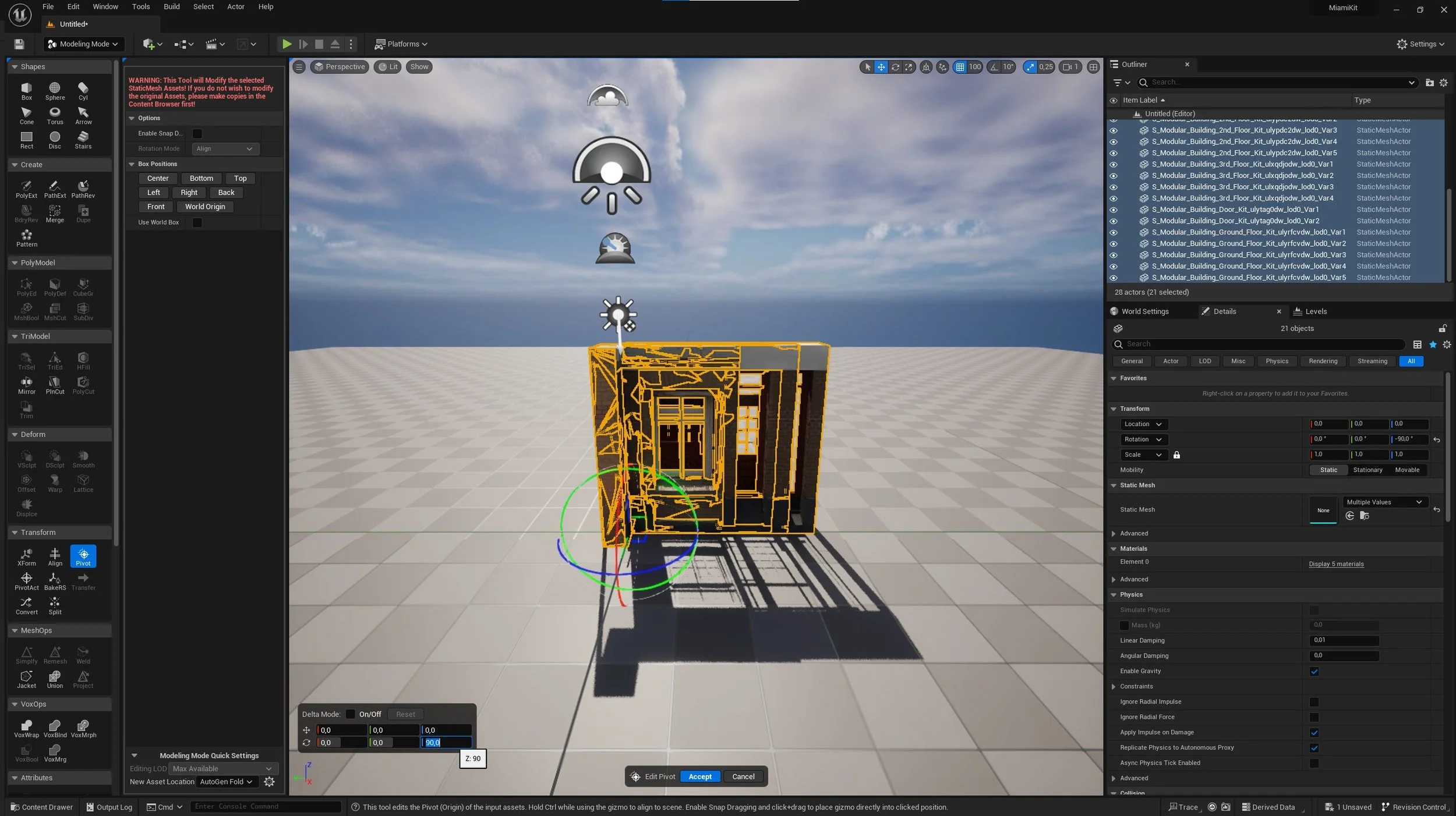 Once in Modeling Mode, select Pivot, and rotate the pivot for all selected meshes so they face the positive X direction. For Megascans assets, this usually means rotating 90 degrees on the Z axis. That’s basically it! However, make sure the pivot is at the front surface of the meshes. Sometimes, depending on the asset pack, it might be at the back. If that's the case, just turn on Snap Dragging in Modeling/Pivot, hold Control, and drag the pivot to the front.